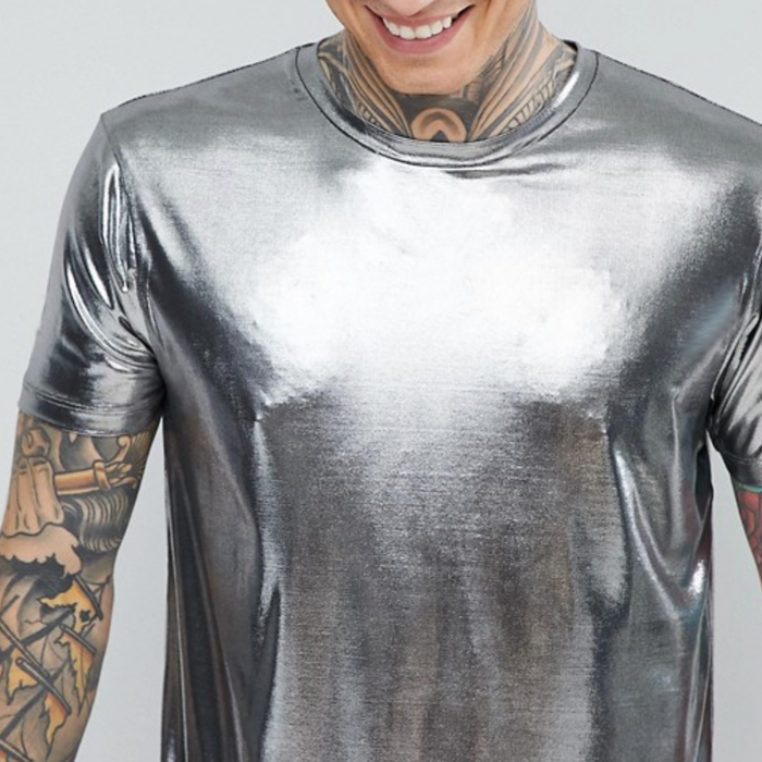 Metallic t-shirt in silky stretch polyester. Can be worn oversized or fitted to enhance your physique. AVAILABLE IN SILVER (shown), GOLD or METALLIC BLACK.