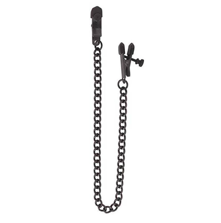 Adjustable wide alligator nipple clamps are great for large nipples that need a wider than usual tip. The wide, rubber-tipped tips distribute the pressure from the clamp, making them good for somewhat gentler play. But don't be fooled the thumbscrews can adjust the clamps to a very strong grip. All-black clamps and black link chain provide a classic fetish look. Non-piercing nipple clamps with broad ends tipped in black rubber for comfort. Adjustable nipple clamps. Non-piercing nipple clamps with broad ends tipped in black rubber for comfort.
